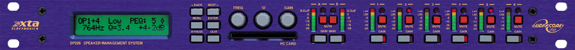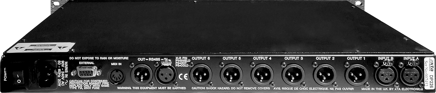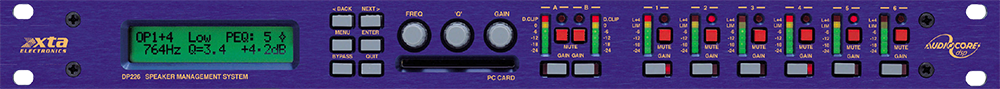 The DP226 is a powerful DSP based audio processor, ideally suited for live sound applications, where it combines the functions of a multitude of conventional products in a compact 1U unit. To achieve this, the DP226 has two inputs and six outputs which can be configured in five basic crossover modes – 3 x 2 way; 2 x 3 way; 4 way; 5 way; and 6 way. Each input has a gain control, variable delay and eight bands of fully parametric equalisation. Each output has a gain control, variable delay, high and low pass filters, five bands of fully parametric equalisation, polarity switching and, additionally, a fully featured limiter. Remote control is catered for in the form of MIDI, RS232 and RS485 ports, and multiple user memories are provided for the storage and recall of settings. Multi-part security lock-out is available for all controls. The DP226 is also available with optional AES/EBU digital inputs and outputs. It has been designed for quick, intuitive adjustment through the use of multiple controls to provide an easy-to-use interface. Alternatively, it may be controlled externally by XTA’s proprietary WindowsTM software, along with existing and future ‘Audiocore’ products.
